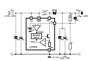 Interesting DC / DC converter Linear Technology has presented the company, this chip is the boost converters that allow you to get the maximum voltage in 34B with the input voltage from 1.2V to 15V. It comes in a compact package of 5 pin SOT23, while for work requiring minimal external circuitry. These chips can be used, for example, a high voltage for the LCD screen or for the varicap.