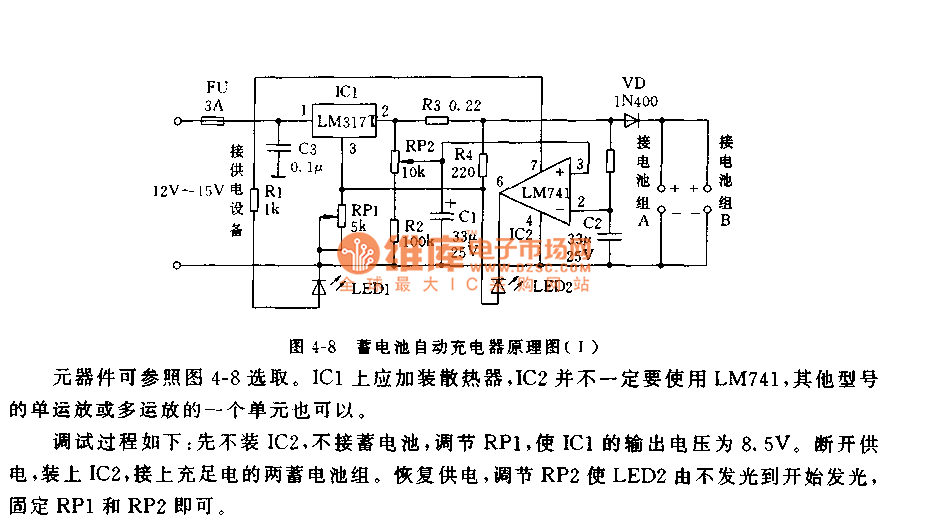 The circuit is as shown in figure 4-8. FU is the short circuit protection tube, LED1 is the power supply instruction, you can change the output voltage of IC1 by changing IC1, the center port of RP2 supplies the reference voltage to the positive phase input port of the voltage comparator IC2, R3 is the charge current sampling resistance, VD can be used to prevent the battery discharging, LED2 is the charging state instruction, C1 and C2 can be used to prevent the pulse interference.