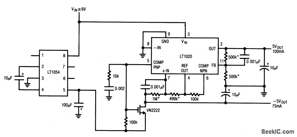 This circuit provides a +5-V output at 100mA and -5-V output at 75mA from a 6-V input.