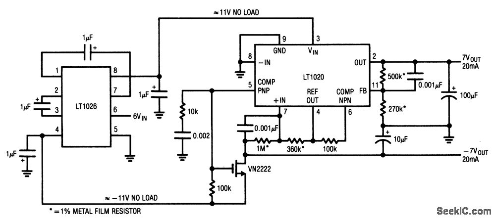 This circuit provides±7-V outputs at 20 mA from a 6-V input.