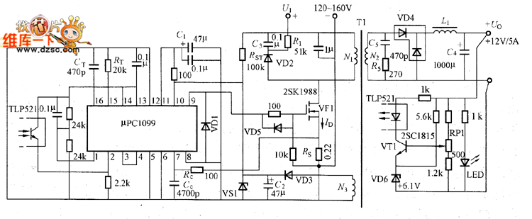 Figure shows the pPC1099 switching power supply.μPC1099 is the switching power supply integrated controller in PWM mode.And it is applied to the primary side control circuit whose main switching components adopt power MOSFET,and the main features are that:it can directly drive the power MOSFET; it is the totem-pole output circuit whose peak output current is 1.2A;it has the fast current of high-impedance;it is the over-current limiting circuit;its oscillation frequency is 50~500kHz;it has the over-voltage protection function and remote control;it uses ⑩-pin DIP and SOP packages.