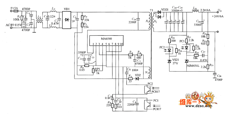 Figure shows the MA6540 switching power supply circuit,the output voltage is 24V,output current is 6A.MA6540 is the IC of excited power MOSFET with part resonance function.