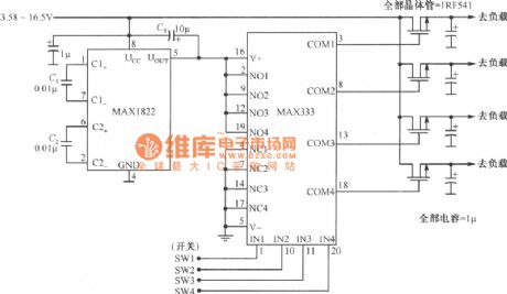 Composed of MAX1822 and MAX333 1~4 channel load switch circuit diagram is shown as below. MAX333 is composed of four amplifiers. When the switch signal SWl ~ SW4 provided to the MAX333 and MAX1822 input signal with the same N01 ~ N04, Comparison of the corresponding output of the amplifier COMl ~ COM4 is high, so the load connected to the corresponding switch.