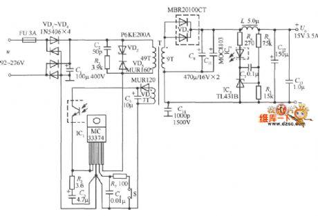 15V/3.5A 52W switching power supply circuit composed of MC33374T/TV as shown. The allowed range of AC input voltage is 92 ~ 276V. Rectifier bridge VD1 ~ VD4 use four 1N5406 3A/600V silicon rectifier tubes. Primary protection circuit is composed of RC absorber circuit (R2, C2) and the clamp circuit (VDz, VD5), it can effectively suppress the peak voltage due to the leakage of high-frequency transformer, to protect the internal power switch of MC33374 from damaged. VDz adopts P6KE200A transient voltage to suppress the diode(TVS), then the reverse breakdown voltage UB = 200V. VD5 uses MURl60 super fast recovery diode (SRD). Note, the serial number of RC R1, C3 in the figure is vacant, according to the need, it can turn the series circuit of R2, C2 into the R1 (20kΩ, 2W) and C3 (0.1μF, 400V) in parallel and then serial ultrafast recovery diode, formed R, C, VD protection circuit.