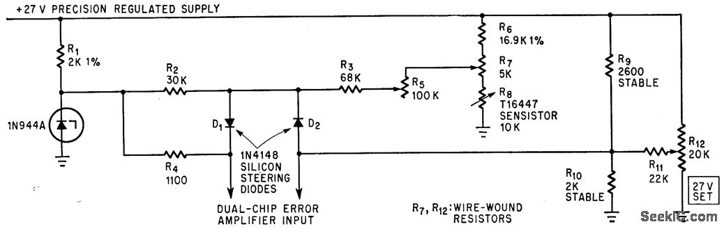 Reference voltage is compared to 27-v output by dual-chip transistor serving as error amplifier. Unique end-compensation circuit using sensistor generates voltage that rises with temperature.-C. H. Moulton, Light Pulse System Shrinks High-Voltage Protection Device, Electronics, 38:11, p 71-75.