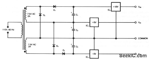 This circuit generates three supply voltages using a minimum of components. Diodes D2 and D3 perform full-wave rectification, alternately charging capacitor C2 on both halves of the ac cycle. On the other hand, diode D1 with capacitor C1, and diode D4 with capacitor C3 each perform half-wave rectification. The full- and half-wave rectification arrangement is satisfactory for modest supply currents drawn from - 5 and +12-V regulators IC3 and IC2. You can use this circuit as an auxiliary supply in an up-based instru-ment, for example, and avoid the less attractive alternatives of buying a custom-wound transformer, build-ing a more complex supply, or using a secondary winding, say 18 Vac, and wasting power in the 5-V regulators.