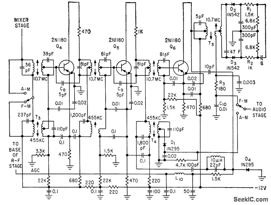 Used in a-m/f-m portable radio. Only two stages operate on a-m.-R. A. Santilli and H. Thanos, Portable Radio Uses Drift-Field Transistors, Electronics, 33:28, p 48-50.