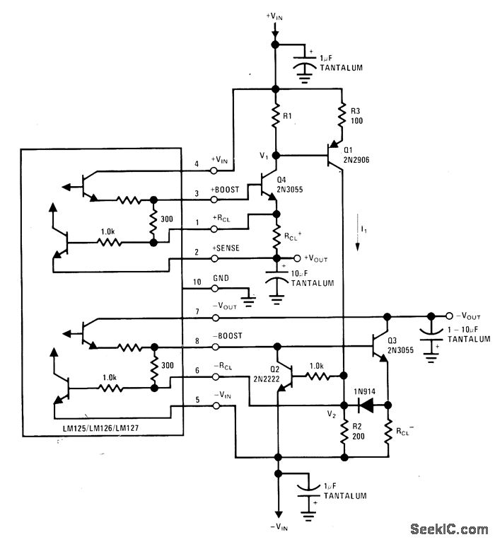 Simultaneous limiting scheme for both sections of National dual tracking regulator depends on output cur-rent of positive regulator. Voltage drop produced across R1 by positive regulator brings Q1 into conduction, with positive load current I1 increasing until voltage drop across R2 equals negative current-limit sense voltage. Negative regulator will then current-limit, and positive side will closely follow negative output down to level of about 700 mV.-T. Smathers and N. Sevastopoulos, LM125/LM126/LM127 Precision Dual Tracking Regulators, National Semiconductor, Santa Clara, CA, 1974, AN-82, p 13.