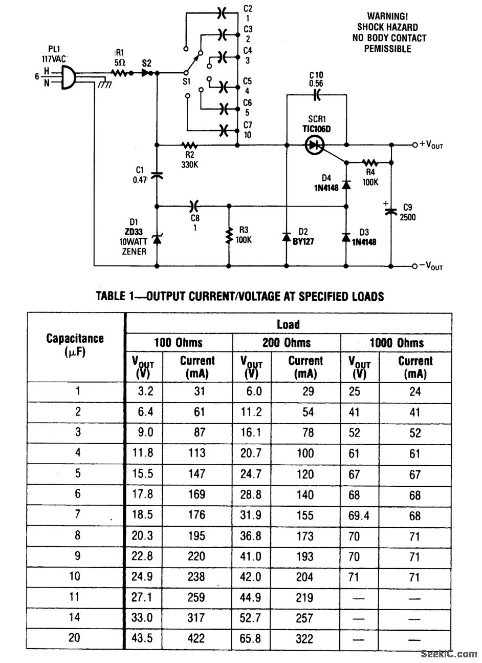 An SCR fires on the positive half cycles of the ac Iine voltage. Switched capacitors are used to select the output voltage. These must all be ac-rated, nonpolarized types.