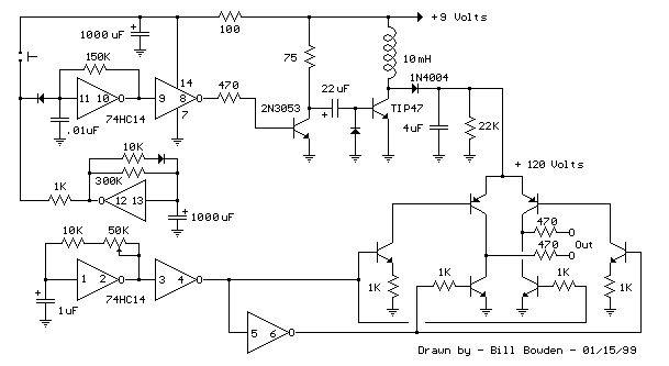 The telephone ring generator shown below generates the needed high voltage from a simple switching mode power supply (SMPS) which employs a CMOS Schmitt Trigger square wave oscillator, 10 mH inductor, high voltage switching transistor (TIP47 or other high voltage, 1 amp transistor) and a driver transistor (2N3053). The inductor should have a low DC resistance of 1.5 ohms or less. The switching supply must have a load connected to prevent the voltage from rising too high, so a 22K resistor is used across the output which limits the voltage to about 120 DC with the phone ringer disconnected and about 90 volts DC connected. The output voltage can be adjusted by changing the value of the 150K resistor between pins 10 and 11 which will alter the oscillator frequency (frequency is around 800 Hz as shown). The supply is gated on and off by a second Schmitt Trigger oscillator (pins 12/13) so that the phone rings for about 2 seconds and then the circuit idles for about a minute between rings. These times can be adjusted with the 10K and 300K resistors connected to pin 12. The push button shown is used to manually ring the phone. The 25Hz ringing frequency is generated by another Schmitt Trigger oscillator (pins 1/2) which controls the H bridge transistor output circuit. The 6 transistors in the output stage (4 NPN, 2 PNP) should be high voltage types rated at 200 volts collector to emitter or more. The ringer will only draw around 10 mA, so the output transistors can have a low current rating but must have a high voltage rating. I used TIP47s and small signal PNPs of unknown numbers that I had on hand, but other types such as NTE287 (NPN) and NTE288 (PNP) should work. Both have a 300 volt C-E rating and cost about $0.95 from mail order houses.