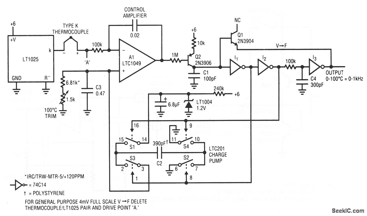 This circuit produces a 0- to 1-kHz output in response to a sensed 0 to 1 00℃ temperature range. Cold-junction compensation is included, and accuracy is within 1℃ with stable 0. 1℃ resolution. A single 4.75- to 10-V supply is required, with a maximum current consumption of 360μA. To calibrate this circuit, disconnect the thermocouple and drive point A with 4.06 mV. Then, set the 1.5-kΩ trim for exactly 1000-Hz output. Connect the thermocouple and the circuit is ready for use. Recalibration is not required if the thermocouple is replaced. Linear Technology Corporation 1991 AN45-8