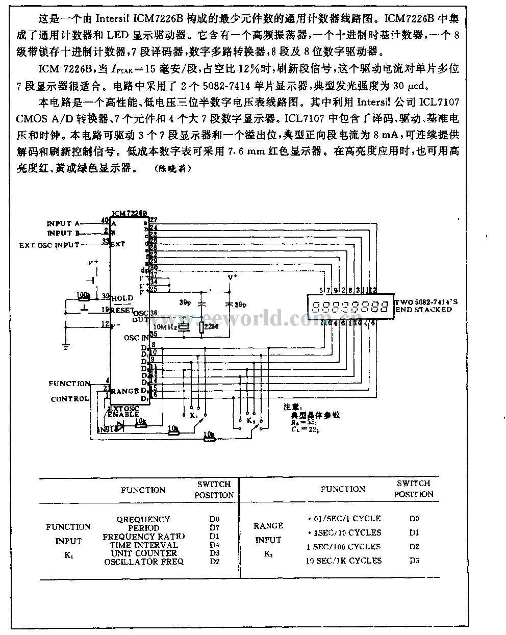 This is a general counter circuit with the least elements, which consists of Intersil ICM7226B. ICM7226B integrates the general counter and the LED display driver, it contains a HF oscillator, a decimal time-based counter, an octal lock decimal counter, 7-stage decoder, digital multi-channel converter, 8-stage and 8-bit digit driver. When Ipeak=15mA/S, duty cycle is 12%, ICM7226B will refresh the stage signal.