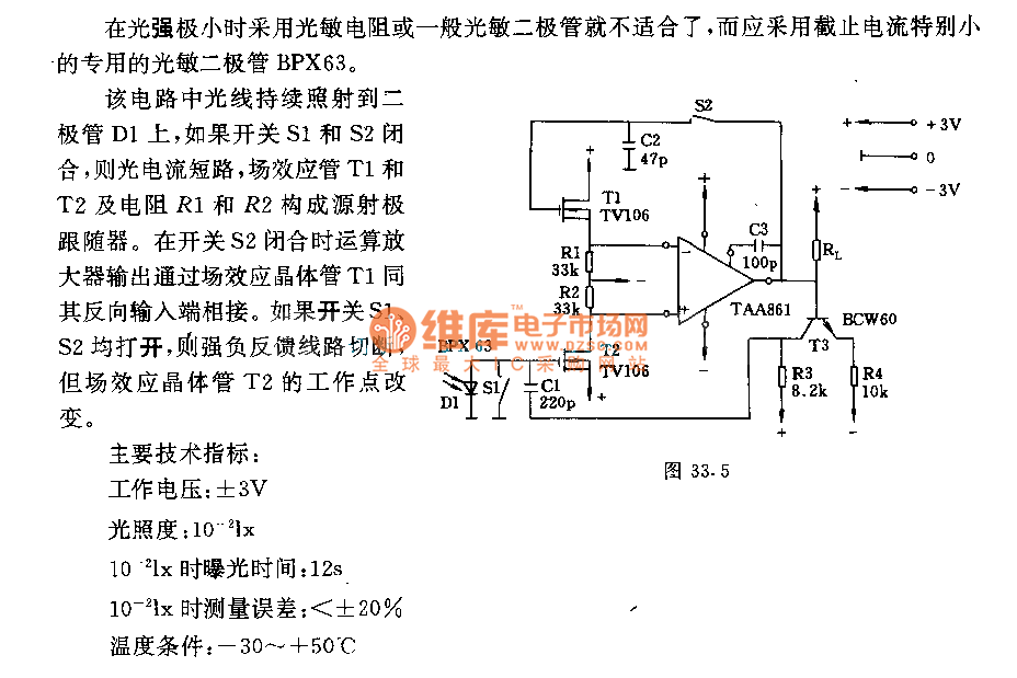 In the circuit, the light constantly shines diode D1, if switches S1 and S2 is closed, then the photocurrent is short-circuited, the source emitter follower is composed of FETs T1 and T2, resistances R1 and R2. When switch S2 is closed, opertional amplifier output is connected to its inverting input terminal by FET T1. If switches S1 and S2 are all open, then the strong negative feedback is cut off, but the work point of FET T2 is changed.