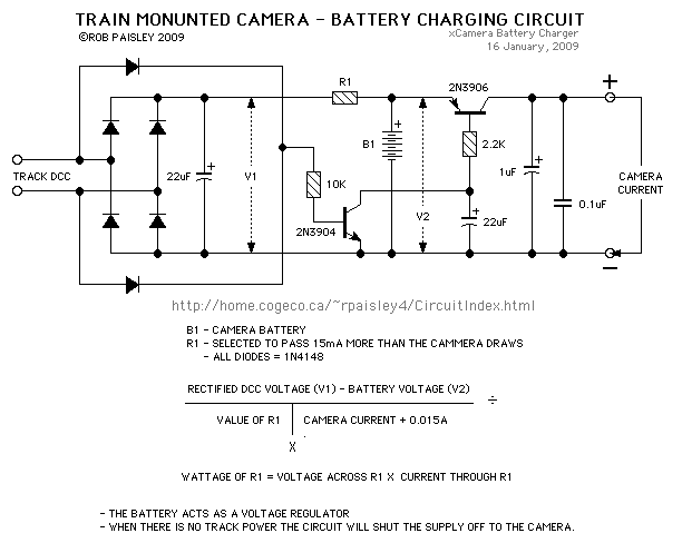 This circuit will keep the battery for a train mounted camera charged and will shut the camera off after a few seconds when power is no longer applied to the track.