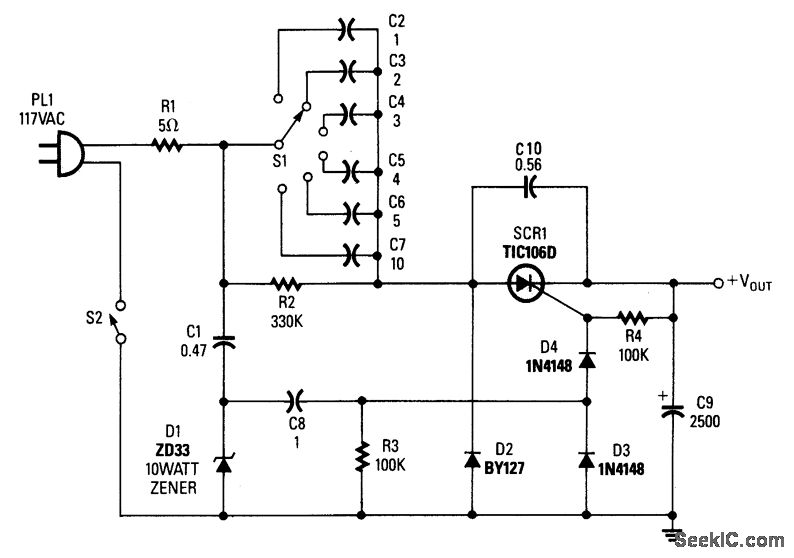 By selecting capacitors, various voltages can be obtained from this supply. Notice that C2 through C7 must be nonpolarized capacitors, such as oil-filled or foil types (Mylar) rated for at least 250 Vac.