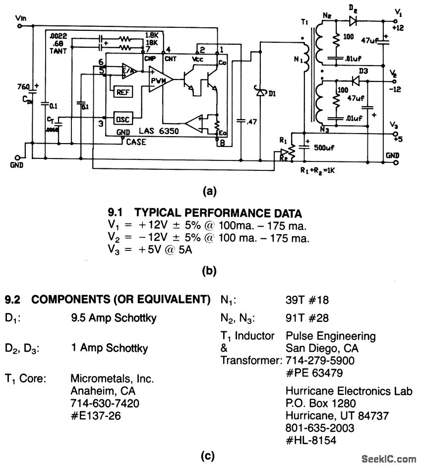 This circuit provides an adjustable +5-V and fixed ±12-V outputs,Figure 4-28B shows typical performance data,Figure 4-28C shows component source information.