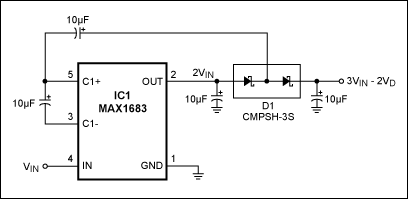 The connections in Figure 1 configure the MAX1683 voltage doubler as a tripler. The no-load output voltage of the circuit is approximately 3VIN - 2VD, where VD is the voltage drop across one diode. Use Schottky diodes as shown to minimize VD and its effect on output voltage.
