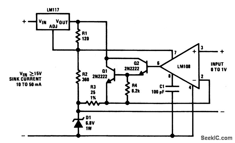 This circuit has a 10- to 50-mA output for a 1-V input. The minimum operating voltage is about 12 V. The circuit can be used in 4- to 20-mA current-transmitter applications (industrial control). However, the LM117 should be selected for low quiescent current.