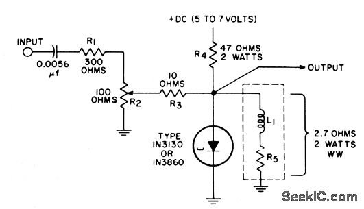 Simple tunnel-diode circuit can synchronize any scope to any constant frequency up to signal-bondwidth limits of scope, even though bandwidths are greater than cro sync circuits can handle. Upper frequency limit of circuit is at least 1.2 gc. Diode oscillates at frequency controlled primarily by L1, but will lock onto uhf input signal and deliver exact subharmonic of input. Can provide countdowns at ratios exceeding 100:1.-F.M. Carlson,Tunnel- Diodo UHF Synchronizer, EEE, 12:2, p 109.