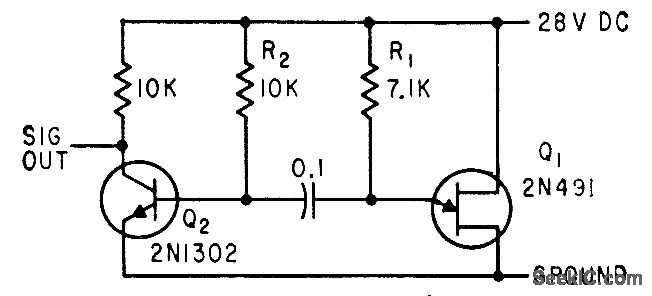 Unijunction transistor serves as multivibrator, with Q2 amplifying its output and providing isolation from load.-F. W. Kear, Unijunction Transistor Pulse-Circuit Design, Electronics, 35:21, p 58-60.