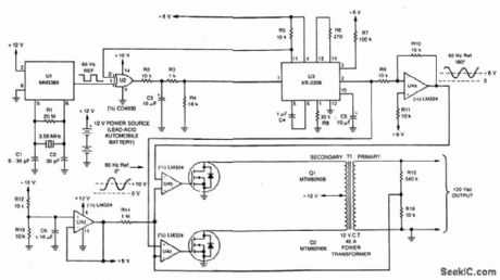 Circuit NotesThe UPS is basically an ac inverter that is powered by a 12-V, lead-acid automobile battery. During power outages, it can supply several minutes of power for an average personal computer. It incorporates a crystal-controlled 60 Hz time base, so that a computer with a real time clock can maintain its accuracy. It isolates the ac line from the computer, so it can be used to operate sensitive electronic equipment on noisy power sources.Two MTM60N06 Power FETs (Q1 and Q2) alternately switch current through a center-tapped 120-V to 12-V filament transformer (T1) with its primary and secondary reversed. The 120-V output is compared with a 60 Hz reference in a closed-loop configuration that maintains a constant output at optimum efficiency.A 60 Hz reference frequency is derived from a crystal oscillator and divider circuit, UI. An inexpensive 3.58 MHz color burst crystal provides the time base that can be accurately adjusted by C1. The 60 Hz output from U1 is applied to the exclusive-OR gate, U2, and then to the XR-2206 function generator (U3) that converts the square wave into a she wave. U2 and U3 form a phase-locked loop that synchronizes the sine wave output o f U3 with the 60 Hz square wave reference of U1. The she wave is then inverted by op amp U4a, so that two signals 180 out of phase can be applied to U4b and U4c that drive Q1 and Q2. Due to the closed-loop configuration of the drive circuits, Q1 and Q2 conduct only during the upper half of the sine wave. Therefore, one TMOS device conducts during the first half of the sine wave and the other conducts during the second half.