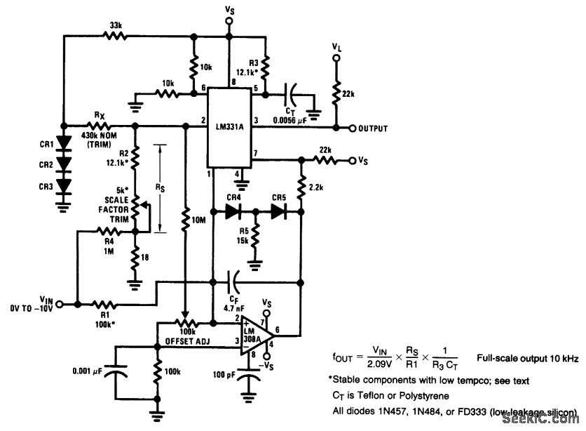 Fig. 12-28 This circuit is capable of better than 0.2% error and 0.003% nonlinearity for a ±20℃ range about room temperature. The basic V/F function of the LM331 is augmented by an LM308A connected as an integrator. To trim, connect the input to ground, and set the offset adjustment for zero output. Remove the ground and apply -10.000 V to the input and adjust the 5-kΩ scale factor trim for 10-kHz output. National Semiconductor Linear Applications Handbook, 1991 p. 1310.