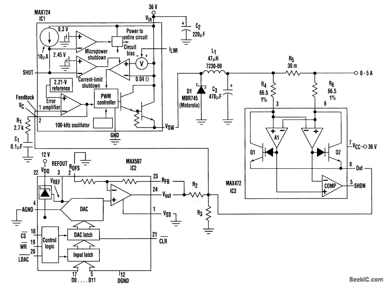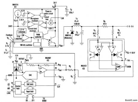 The variable-current source generates 0 to 5 A with a compliance range of 4 to 30 V. The 12-bit digital-to-analog converter (DAC), IC2, makes it digitally programmable. The switch-mode step-down regulator, IC1, is more efficient than the alternative current source with linear pass transistor.IC3 is a high-side current-sense amplifier. In this circuit, it senses output current as a voltage drop across R5, and produces a proportional signal current at pin 8. The regulator's feedback voltage (IC1 at pin 1) is set by the DAC and modified by IC3's current feedback, which flows across a parallel combination of R2 and R3. This current feedback opposes any change in load current because of a change in load resistance. The DAC generates 0 to 10 V, producing a source current that varies inversely with code: FFFHEX (10 V from IC2) produces 0mA, and 000HEX (0V from IC2) produces 5 A. The circuit can be reconfigured for other ranges of output current (Isource) by resizing R2 and R3: