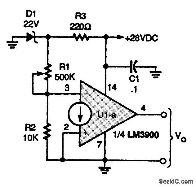 This variable-voltage source can provide between 0.6 and 20 V, depending on the setting of R1.