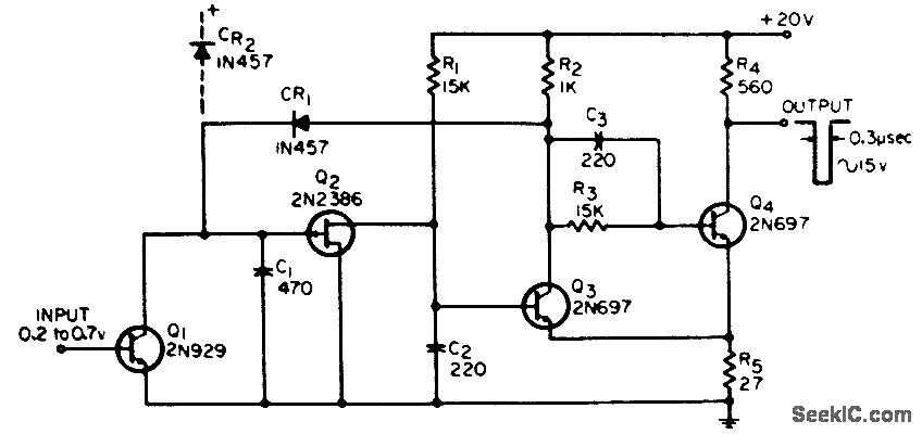 Input change of only 0.5 v will change pulse repetition rate of generator by factor of more than 1 to 10,000,000. Output pulse is about 0.3 microsec wide, with rise and fall limes of 20 nsec. Addition of back-biased diode CR2 extends low-frequency limit below 0.05 pps.-G. Richwell, Wide-Range Voltage-Controlled Pulse Generator, EEE, 13:10, p 72-77.