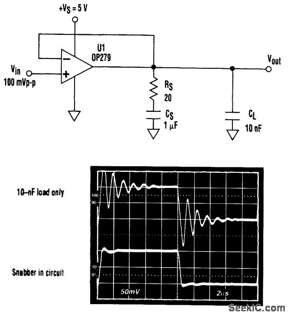 A unity-gain voltage follower driving a capacitive load is prone to stability problems. Using an RC snubber network (RS-RC) allows capacitive loads, such as CL to be compensated without loss of load drive.