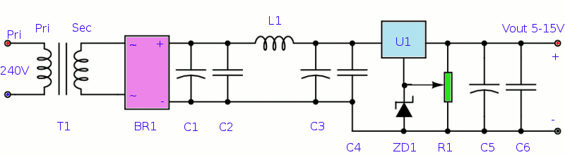 This is a similar power supply that I used to power my FM Transmitter. After suffering long problems with mains hum, this design using a pi filtered C-L-C approach. This circuit offers excellent ripple rejection.