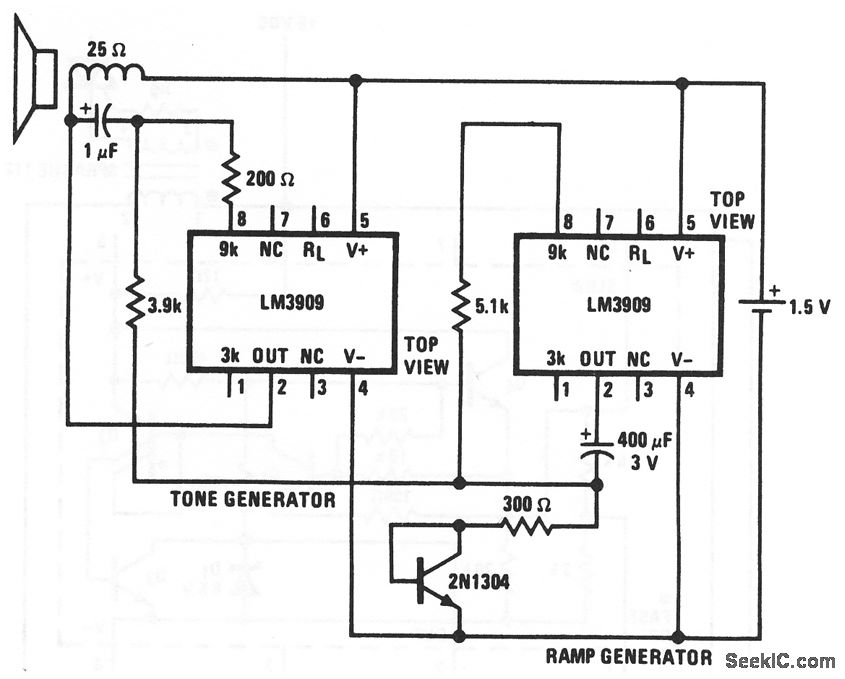 This circuit uses two LM3909s, one as a tone generator and one as a ramp generator, to produce a whooper sound that is somewhat like the electronic sirens that are used on city police cars, ambulances, and airport crash wagons. The rapid modulation makes the tone seem louder for the same amount of power input. The tone generator is similar to that of the Fig. 12-55 circuit, except that the pushbutton is replaced by a rapidly rising and falling modulating voltage that is produced by the ramp generator. National Semiconductor Linear Applications Handbook 1991, p 402,