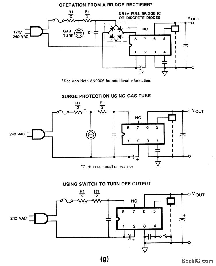 The HV-2405 converts ac into regulated dc, as described for the HV-1205 (Figs. 7-6 and 7-7), except that the HV-2405 operates from either 120 or 240 Vac (without special connections or a changeover switch). Recommended values for components shown in Figs. 7-8C through 7-8G are as follows: fuse F1=1/2 A, 2AG; R1=150 g; C1=0.05 μF, ac rated; MOV=V130LA20, or gas tube, which arcs at less than 500 V for 240 V use; C2, C3, C4, R2, RA, RB, and VZ are the same as for HV-1205. The HV-2405 does not provide isolation from the line (both ground and ac return are above ground).