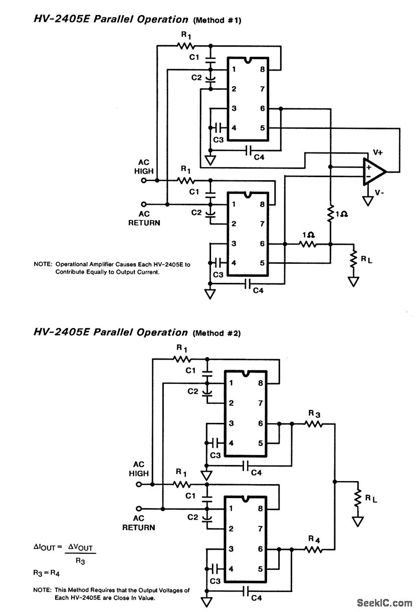 These two circuits show two HV-2405 single-chip supplies (Fig. 7-8) connected in parallel to increase current capability.