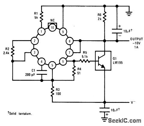 National LM195 power transistor, used with LM105 regulator, provides full overload protection. Load regulation is better than 2 mV. Circuit requires only 2-V differential between input and output voltages.-R. Dob-kin, Fast IC Power Transistor with Thermal Protection, National Semiconductor, Santa Clara, CA, 1974, AN-110, p 5.
