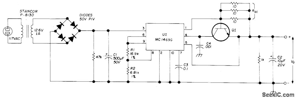 Provides 0.1% regulation as required for PLL RTTY tuning unit and other critical applications. RSC and Q1 provide short-circuit protection for regulator.When output current reaches about 200 mA, Q1 turns on and limits regulator output. U1 can be Motorola MC1469G or HEP C6049G, and at is any general-purpose NPN silicon transistor.-E. Law-rence, Precision Voltage Supply for Phase-Locked Terminal Unit, Ham Radio, July 1974, p 60-61.