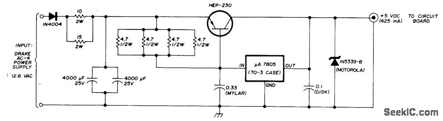 Developed for syllabic VOX system used with Drake T-4XB and R-4B transmitter and receiver. Input is taken from 12.6-VAC transformer winding of power supply for Drake, so equipment power switch also turns off 5-V supply. - R.W. Hitchcock, Syllabic VOX System for Drake Equipment, Ham Radio, Aug. 1976, p 24-29.