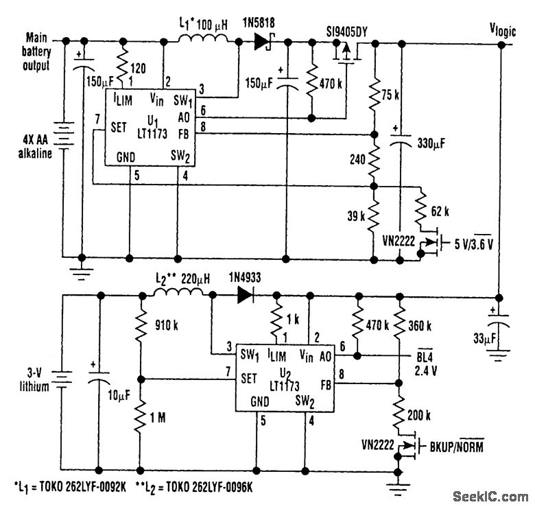 With this unique logic-power-converter design (see the figure), a switchable 3.6 or 5 V at 200 mA can be attained by using four AA cells. The supply incorporates a MOSFET switch that can switch to a lithium backup battery, providing a 3.4-V output when the main battery is dead or removed. The supply consumes only 380 pA under no-load conditions.