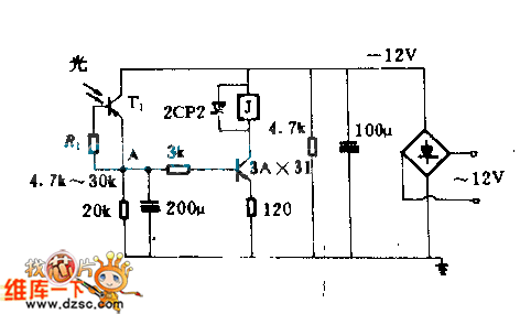 Capacitor of 200μF and resistor of 3 KΩ form the charging circuit, ensuring that electric potential of point A would not increase rapidly in the absence of light. The circuit plays the role of delaying and avoids the relay working too often. Resistor of 120Ω is the current feedback resistor, aiming to stabilize the operating point of 3AX31. 2CP2 is used to protect 3AX31.