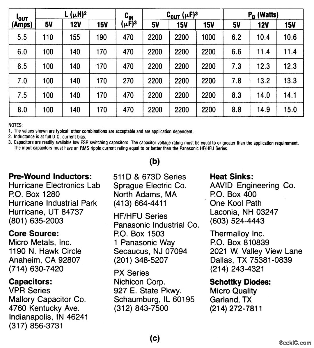 This circuit shows a dc/dc converter with adjustable output.Figure4-16B shows the values of Cin,Cout、andL required for Various input and output voltages,The part numbers required for various output-current limits are given in Figs.4-7 through 4-14,For example, use LAS-6320/6420 for currents up to 2 A、LAS-6330/6430 for currents up to 3 A,LAS-6350/6450 for currents up to 5 A、and LAS-6380/6480 for currents up to 8 A. Figure 4-16C shows information on component sources.