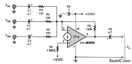 An audio mixer is a handy circuit that will combine two or more audio signal sources into one signal channel. The figure shows an audio mixer that is built around the LM3900 CDA. The crux of this circuit is the three input networks, principally R3, R4, and R5. These resistors are connected to different input sources (labeled VIN1,VIN2, and VIN3). Those three resistors all connect to the inverting input of the CDA. The gain is approximately