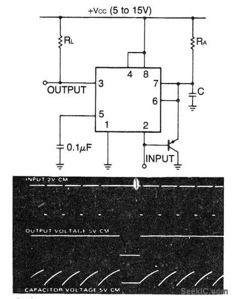 Missing pulse detector using an ECG955M timer/oscillator chip. The timing cycle is continuously reset by the input pulse train. A change in frequency or missing pulse allows completion of the timing cycle, which causes a change in the output level. The time delay should be set a little longer than normal between pulse for this reason (courtesy GTE Sylvania Incorporated). (View)