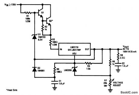 This circuit can source or sink up to ±150 mA with only 5 mA quiescent current. The value of C2 can be increased as necessary to absorb current transients. (View)