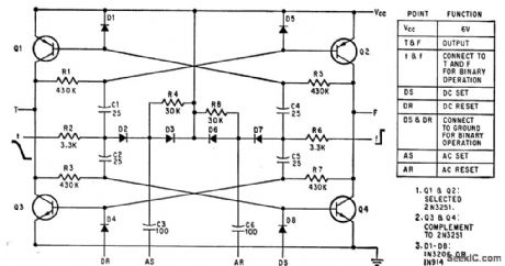 Complementary-pair circuit keeps power dissipation below 2 mw, with standby power of only 150 microwatts. Consists of two interconnected flip-lops, sharing common diode steering network at input. Diodes D1, D4, D5, and D8 protect emitter-based junctions from breakdown and also increase switching speed by clamping back bias levels at base of transistor. May be used for binary operation, as staler, or as shift register.-M. E. McGee and J. H. Wujek Jr., One-Megahertz Flip-Flop Saves Standby Power, Electronics, 39:12, p 106-107. (View)