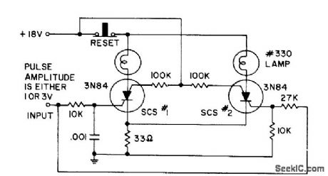 Input of1 v triggers SCS1 but not SCS 2. Input of 3 v is delayed in reaching SCS1 by R-C info. grating network and therefore triggers SCS2, which raises common-emitter voltage lo prevent SCS1 from triggering. - Transistor Monual, Seventh Edition, General Electric Co., 1964, p 433. (View)