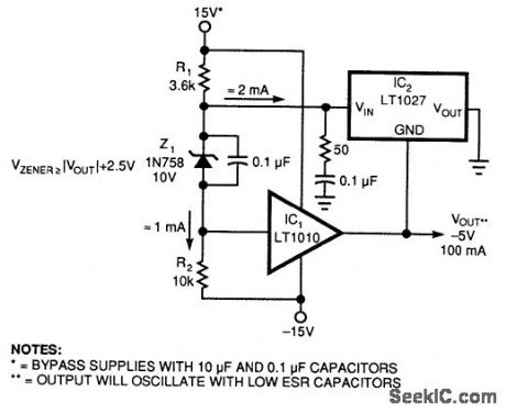 A method of boosting the output current of a reference and also protecting against overloads is shown in Fig. 66-5. IC1 acts as a power buffer. The LT1027 forces the output of VOUT and ground to be 5 V. The RC damper (50Ω and 0.1 μF) provides loop stability. The output might oscillate if low ESR capacitors are connected to it, so use aluminum electrolytic or tantalum capacitors instead of ceramic or mylar. (View)