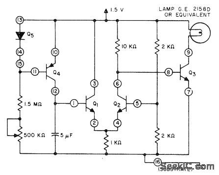 RCA CA3096E fivetransistor array drives indicator lamp thatcomes on at end of timing interval,Q5 is one of PNP transistors in array connected as diode.- Linear Integrated Circuits and MOS/FET's, RCA Solid State Division,Somerville,NJ,1977,p205-210. (View)