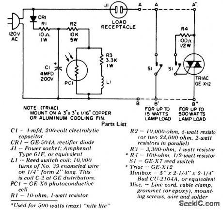 Automatic night light to discourage prowlers or burglars. One of two circuits can be built as shown in the schematic, depending on the requirements. For small loads, 15 watts, the reed switch can directly control the light (courtesy General Electric Company). (View)