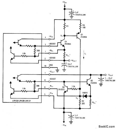 Limiting action of circuit depends on output current of positive regulator but acts simultaneously on both positive and negative outputs of National LM125 dual tracking regulator. Positive output current produces voltage drop across R1 that makesQ1conduct. When increase in current makes voltage drop across R2 equal negative current limit sense voltage, negative regulator will current-limit. Positive regulator closely follows negative output down to level of about 700 mV.Q2 turns off negative pass transistor during simultaneous current limiting. Output voltages are ±15V.- Linear Applications, Vol. 2, National Semiconductor, Santa Clara, CA, 1976, AN-82, p 12-13. (View)