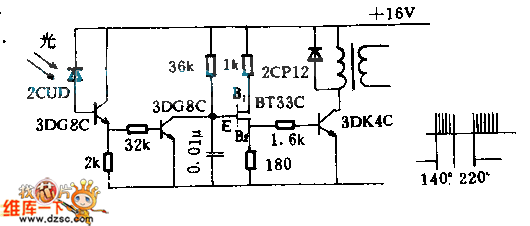 Where there is no light, the two 3DG8C close. The double-base diode oscillator works, resulting in sharp pulse output waveform. Such would be amplified by 3DK4C to output trigger pulse waveform of the terminal, just as shown in the figure. Partial electrical angle with a pulse output is 140 ° and partial electrical angle with no pulse output is 220 °. This trigger pulse waveform is sent to the SCR inverter.